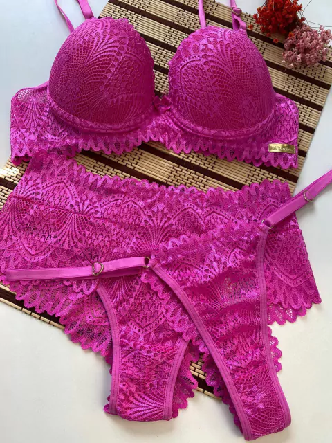O conjunto é composto por um sutia de bojo com aro que inclui duas calcinhas inteiramente rendadas: uma com laterais mais largas, proporcionando um toque de sofisticação e conforto, e a outra, com regulagem, permitindo ajustes personalizados. Este conjunto versátil é a escolha perfeita para quem busca estilo, sensualidade e opções.